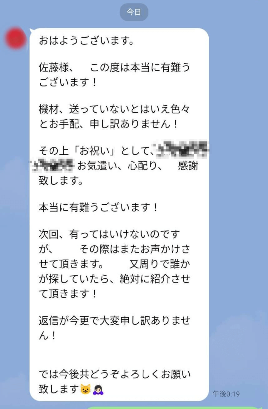 猫が脱走してから心配で夜も眠れない日が続きましたが、「我々が捜索している時は少しでもお休みしてください」とおっしゃってくれて、私の気持ちに寄り添ってくれた事は今でも覚えています。